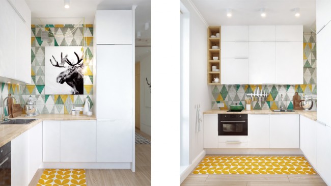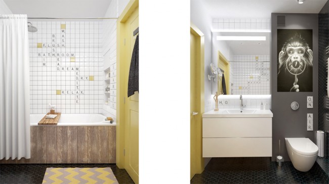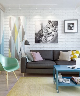 Arredare un appartamento di 45 mq con armonia, amore, soluzioni e predisposizioni di spazi intelligenti e giocosi con colori tenui nonostante lo spazio limitato si può fare. Guardate l’appartamento in questione e ditemi se non è fresco e spazioso?! Il bianco combinato con le decorazioni in pastello, i mattoni contrastano con l’insolito bar e il cruciverba nel bagno affascina. Semplicità ed eleganza negli interni vanno di pari passo con l’architettura.