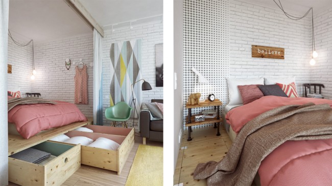 L’appartamento è composto da un soggiorno, cucina e zona notte. Il letto è strategicamente situato sulla piattaforma alta a cassettoni per separare visivamente la camera da letto dal soggiorno ed inoltre offre spazzi aggiuntivi indispensabili per chi risiede in appartamenti piccoli poco spaziosi. Per questo motivo si consiglia sempre di optare per arredi multifunzionali trasformabili. Colori pastello (rosa pallido, verde menta e giallo polveroso) aumentano la sensazione di calore e tenerezza, la creazione di una casa favolosa è l’ideale per una giovane donna.